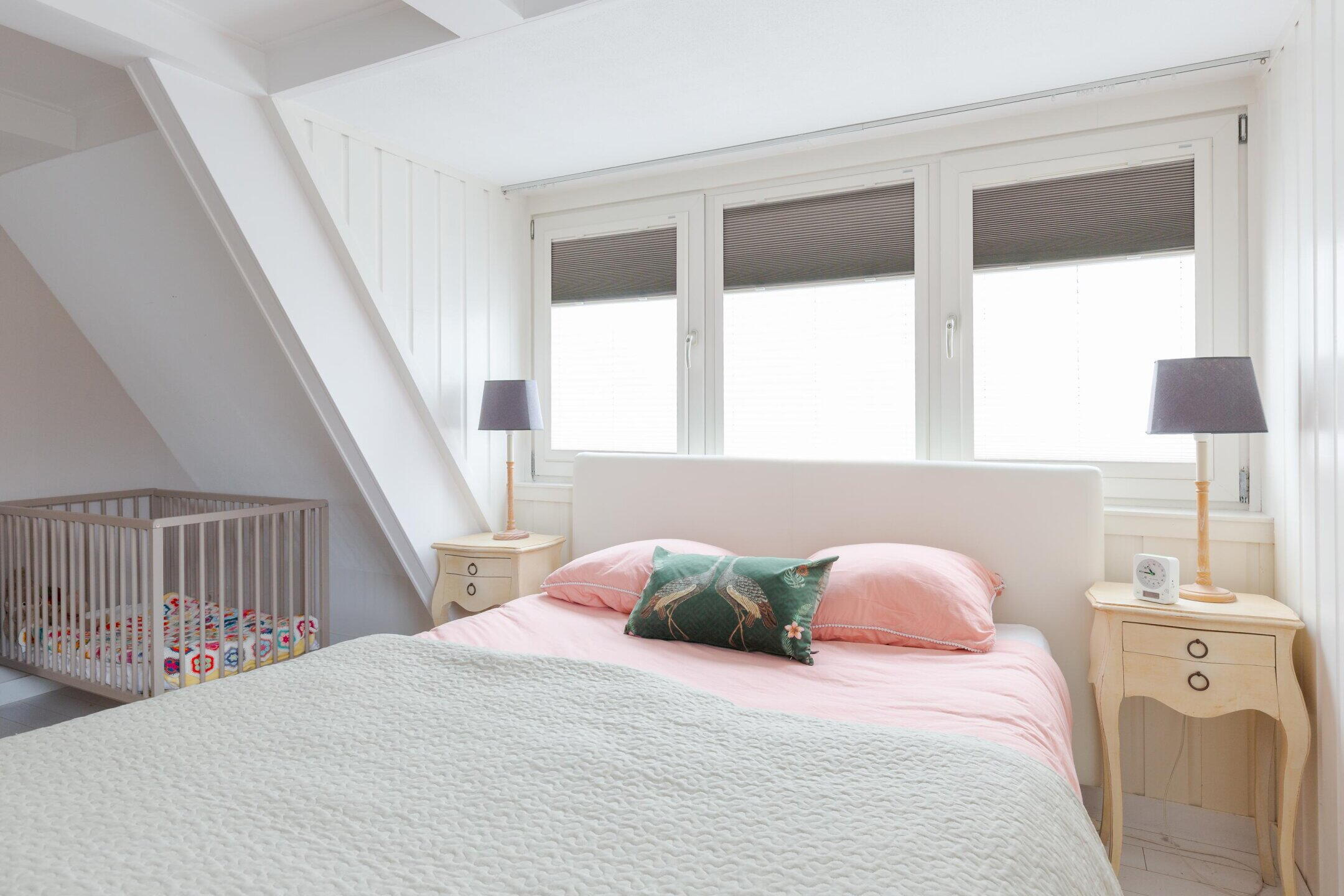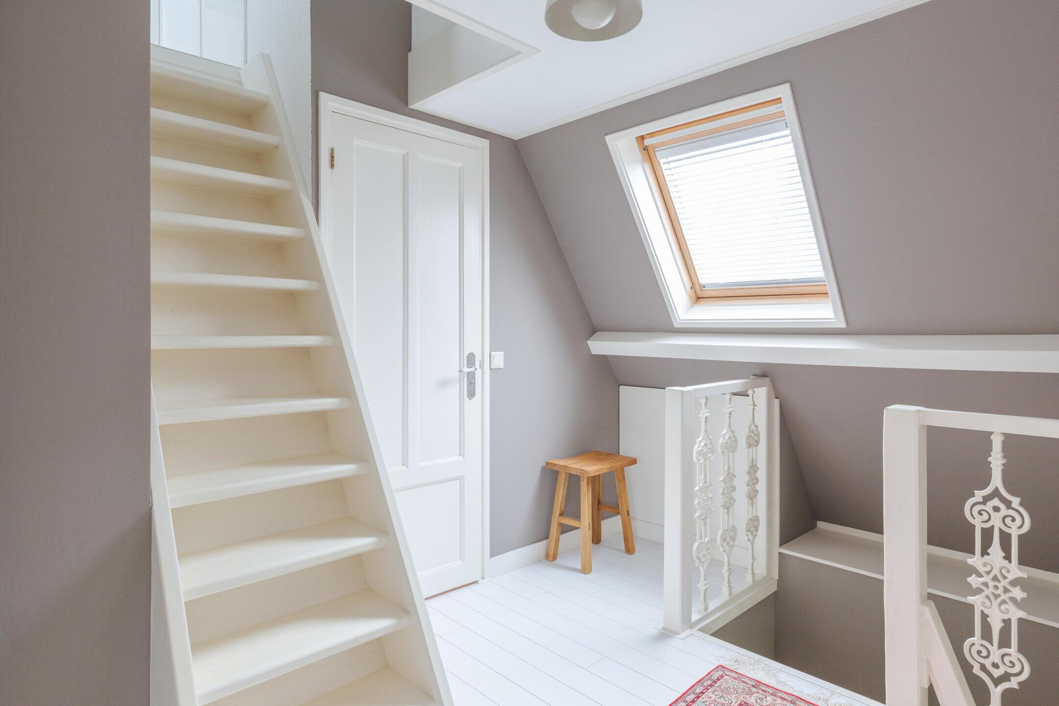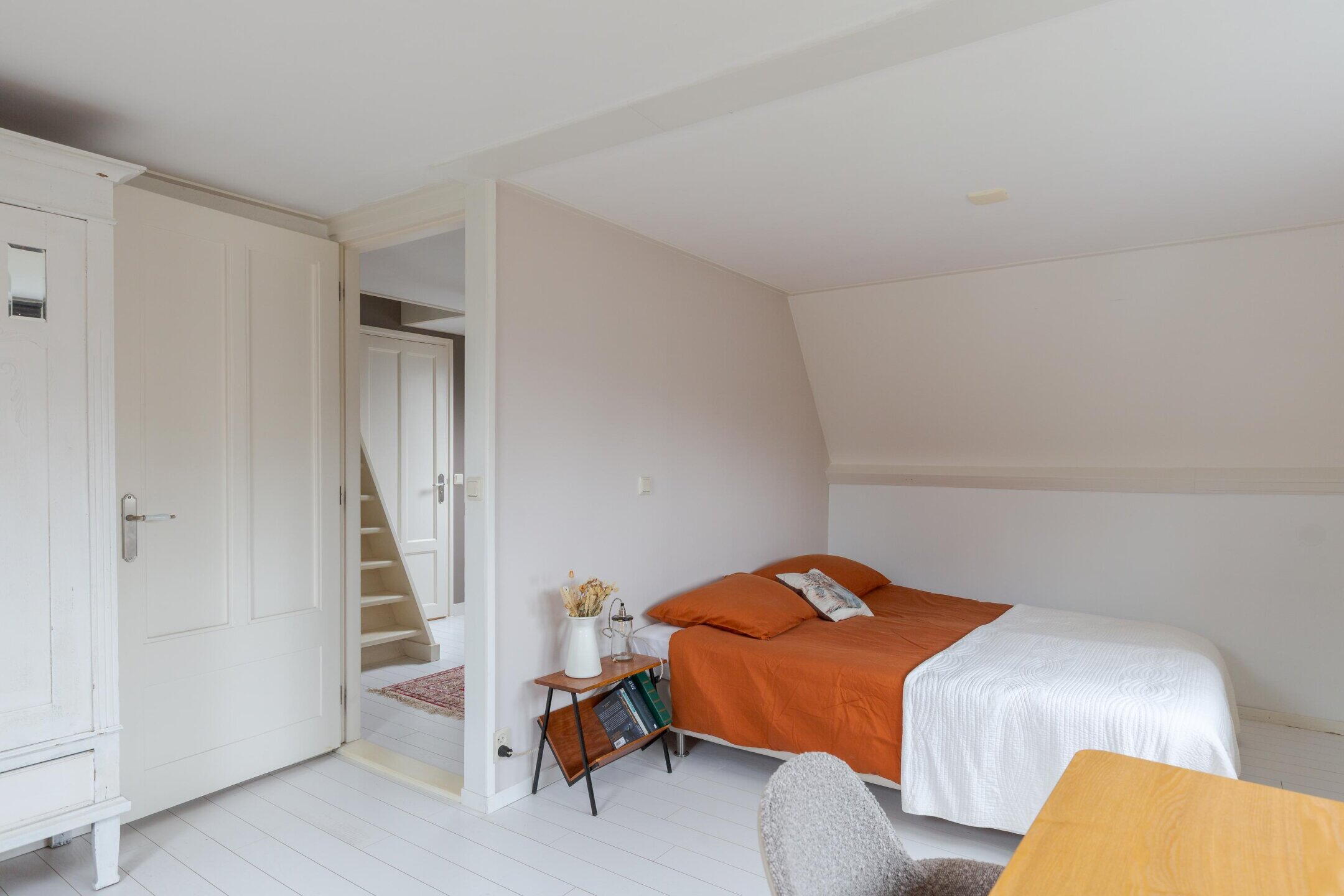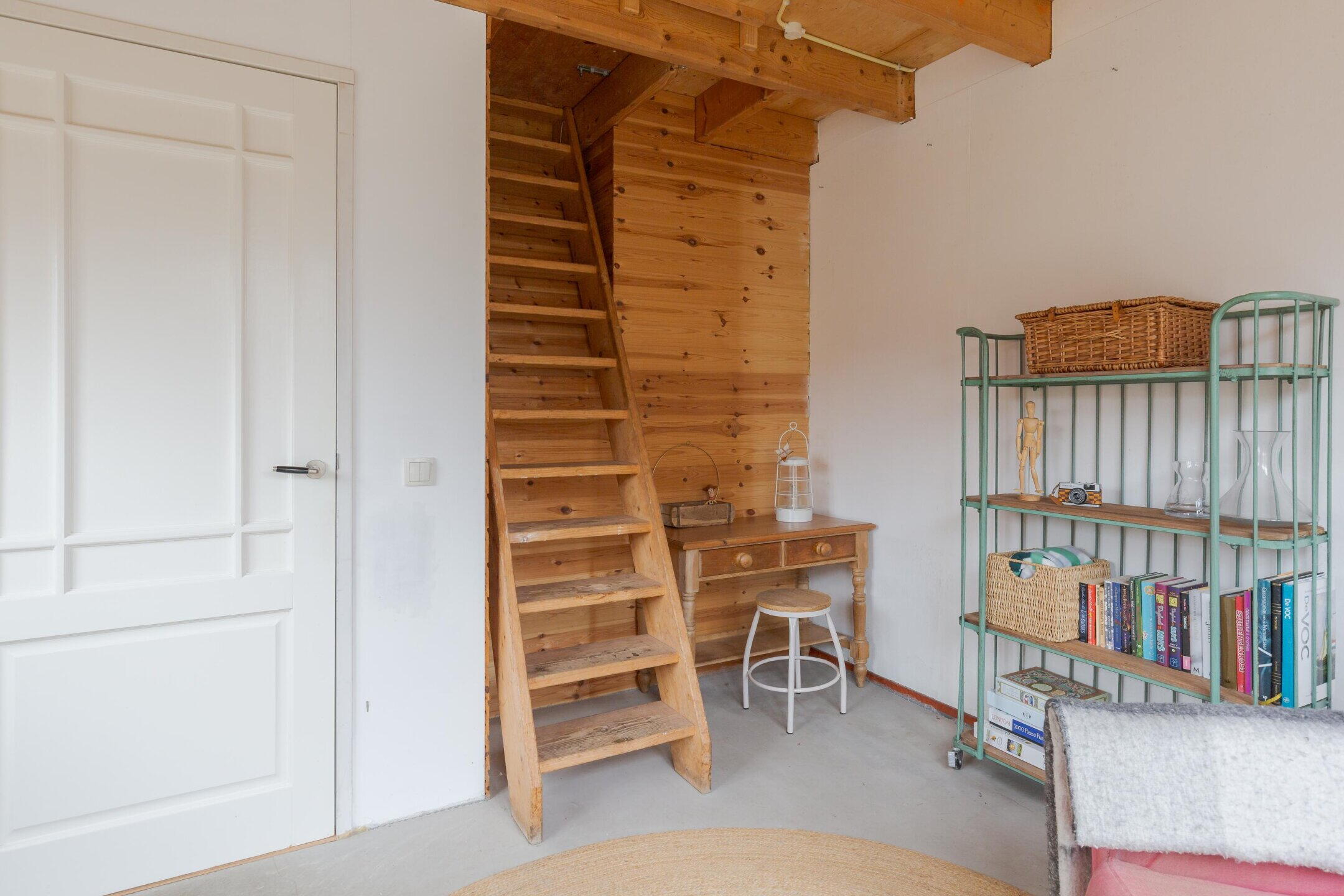 Een vaste trap brengt je naar de tweede verdieping met nog eens een slaapkamer en bergruimte.