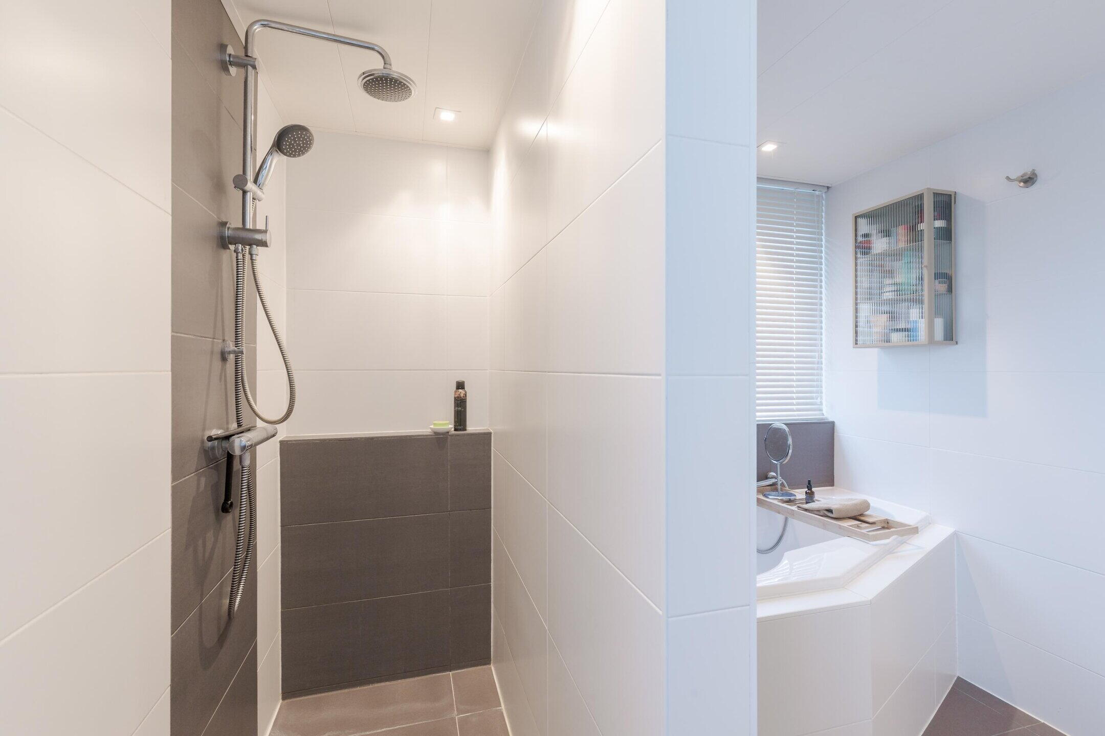 - Ligbad, toilet, dubbele wastafel, inloopdouche