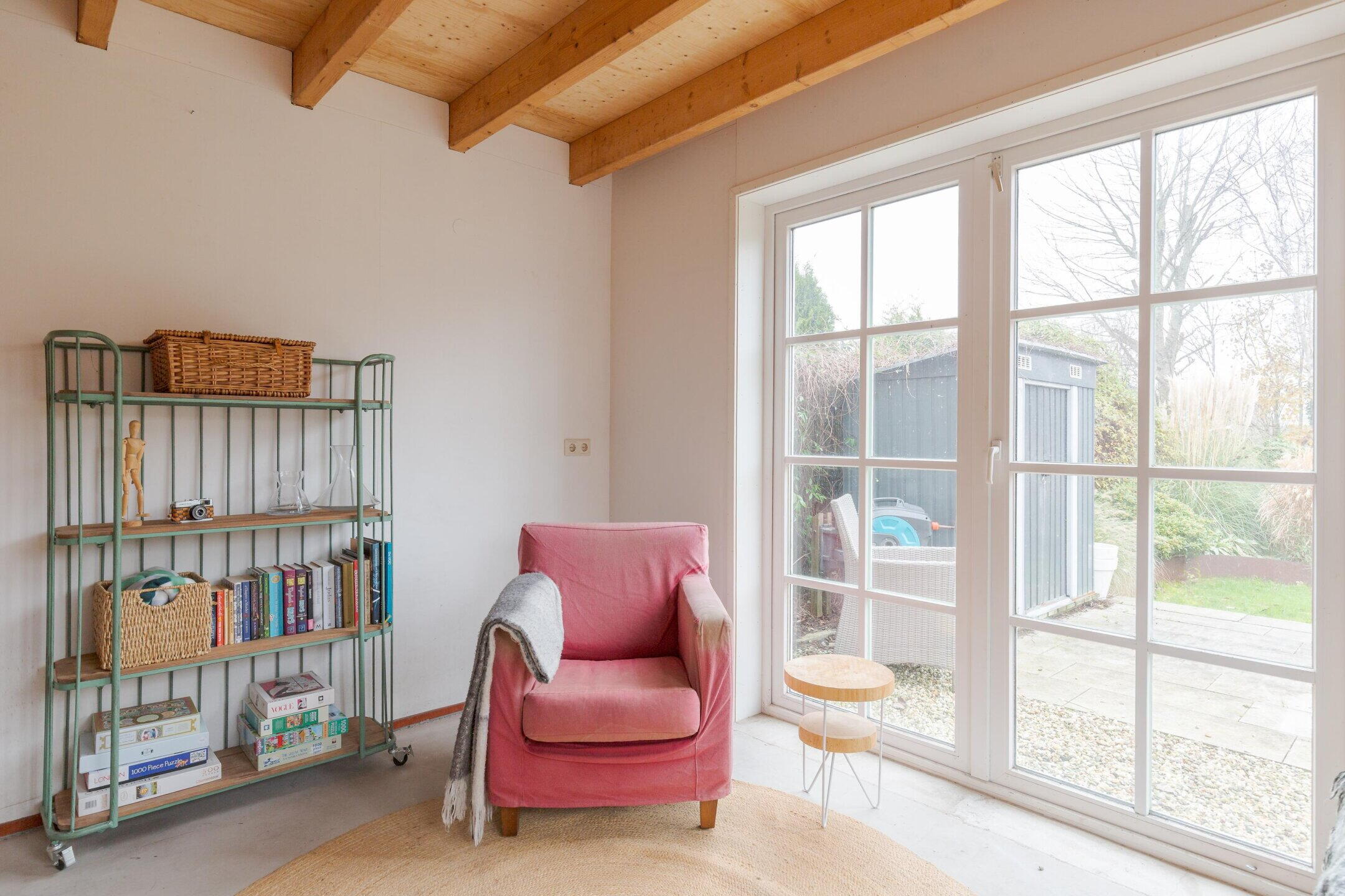 In de achtertuin staat de vrijstaande garage met kap. Een deel van de garage is omgebouwd tot een woonkamertje met keukenblok. En een trap naar de bergzolder, waar je natuurlijk ook nog een slaapkamer van kunt maken. Stel je eens voor wat een mogelijkheden: praktijk of kantoor aan huis, hobbyruimte, of gewoon een plek voor je puberzoon of dochter.