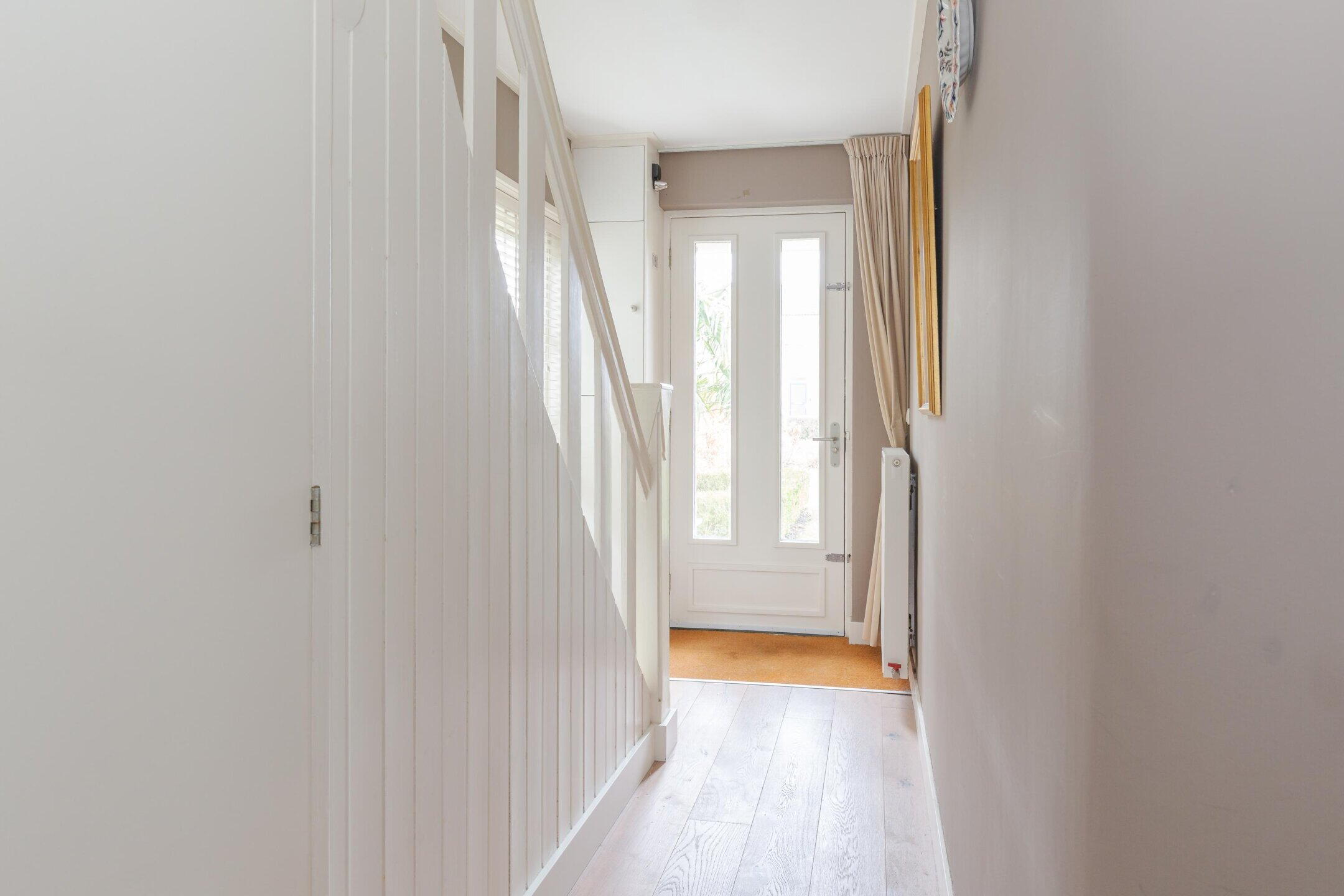 Op de eerste verdieping vind je twee slaapkamers waarvan de grootste aan de voorzijde voorheen twee kamers waren. Dit is eenvoudig weer terug te brengen als je meer slaapkamers nodig hebt. En dan de badkamer, ruim, luxe, modern, met een inloopdouche, dubbele wastafel, toilet en ligbad.